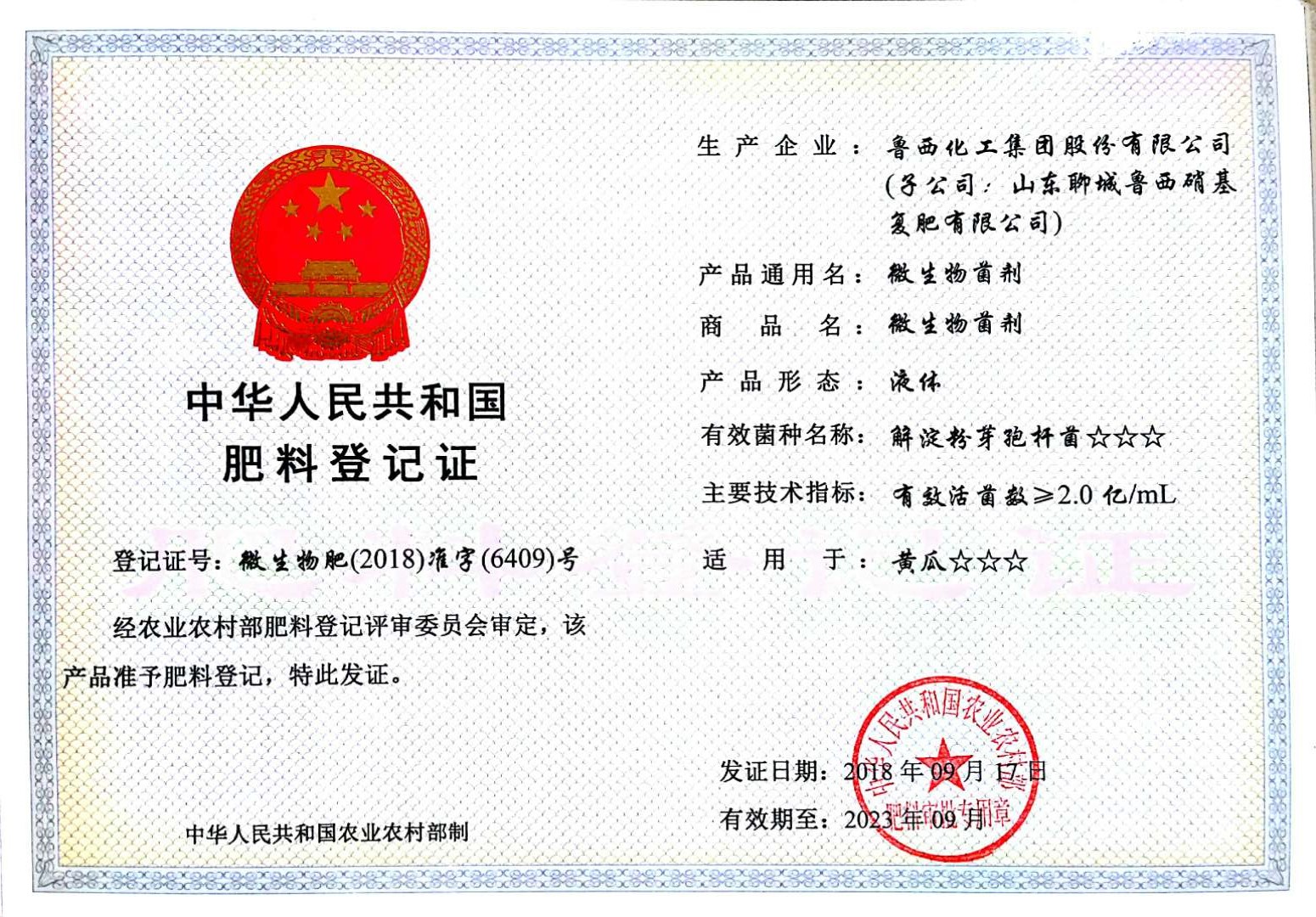 10月7日,收到了农业农村部肥料评审登记管理处寄来的鲁西集团农业用微生物菌剂肥料登记证书,共涉及两个菌种:解淀粉芽孢杆菌、多粘类芽孢杆菌。登记证号分别为“微生物肥(2018)准字(6409)号”、“微生物肥(2018)准字(6410)号”。登记证有效期至2023年9月。