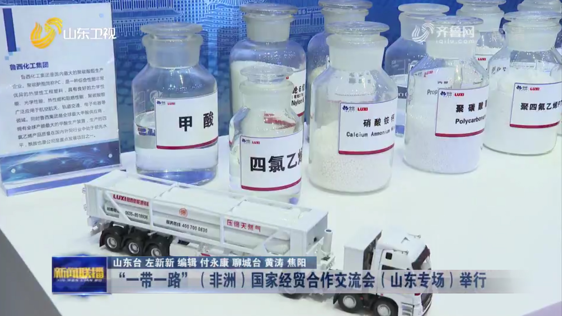 5月13日,“一带一路”(非洲)国家经贸合作交流会山东专场在聊城市以视频形式举行。在外贸优品现场展览展示区,鲁西集团甲酸、丙酸、甲酸钠、环己酮、聚碳酸酯、硫酸铵、储气瓶组、管束式集装箱等产品及模型进行了展示。