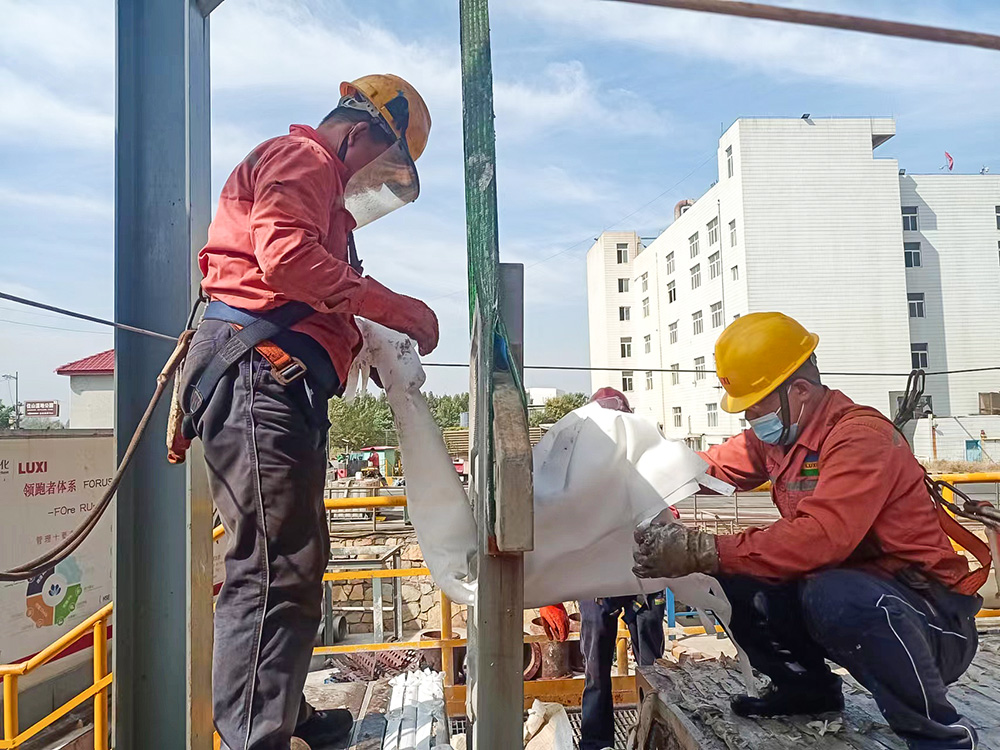 与此同时,氯化钙事业部无水二期西套的检修工作也在紧张有序的进行着。调度室主任陈明涛和技术科科长周瑞兵正在对设备进行拆检维修,节日期间他们发挥引领示范作用,带头盯靠现场,和员工一起参与检修。压滤机二层平台几名运转班人员在进行滤布更换工作,他们穿戴好劳保用品,系挂好安全带,将旧滤布拆除后,再完成新滤布的卷压、穿引、安装……整个过程大家得心应手,配合默契。