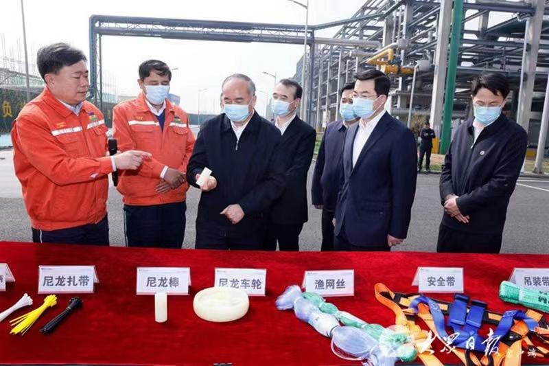 “年产60万吨己内酰胺/尼龙6项目是2023年省重大项目,属于省‘十强产业’中的新能源新材料产业项目。”在项目建设现场,公司高级副总经理王富兴向林武书记详细汇报了项目建设规模、工程进度、项目工艺、产品性能及市场竞争优势等情况。林武书记现场询问了项目建设安全管控、生产能耗、节能降碳措施以及产品应用领域等。林武书记指出,针对目前国家对原料煤的考核政策调整,鲁西集团在严格执行国家最新能耗、环保标准的基础上,要推进原料用煤的高效利用项目,坚定不移推动绿色低碳高质量发展。同时要求地方政府全力配合企业的项目建设,做好服务保障,优化发展环境,用心用力解决项目建设中的难题,努力将项目做成样板工程。